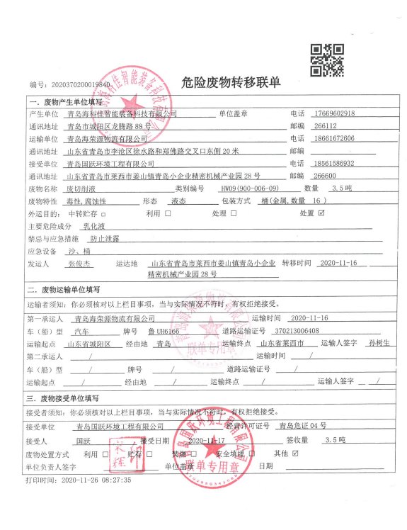 廢物運輸單位:青島海榮源物流有限公司 運輸時間:2020-11-16 運輸車:汽車 牌號:魯UH6166