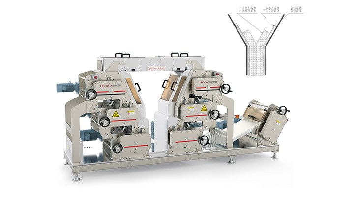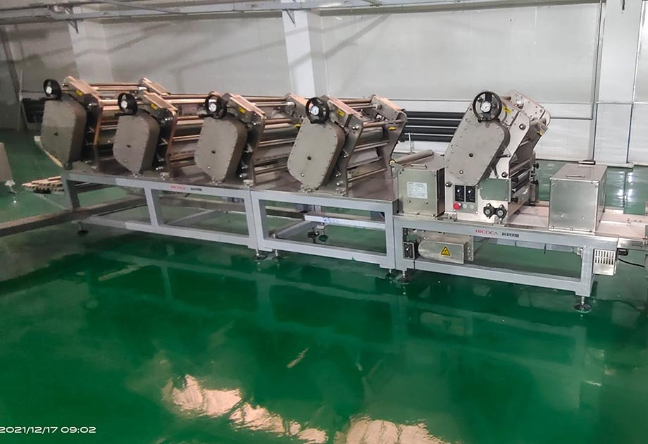 -面帶經過連續壓延輥壓成細密的、達到規定厚度要求的薄面片,形成更為完善的面筋網絡,面帶水分分布更加均勻,面帶具有一定的韌性和強度。