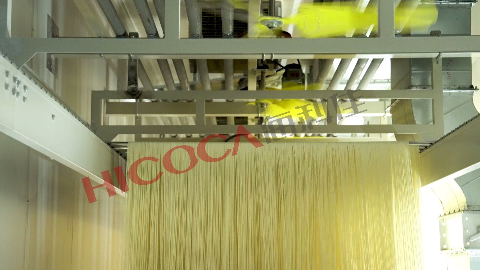 掛面生產(chǎn)線最后烘干區(qū)間設(shè)置不易過短(適宜的區(qū)間長度為烘道總長的25 %-30%),否則烘道尾端與包裝間空氣之間的溫濕度差異過大,掛面極易因驟熱驟冷或回潮吸濕而造成酥條。