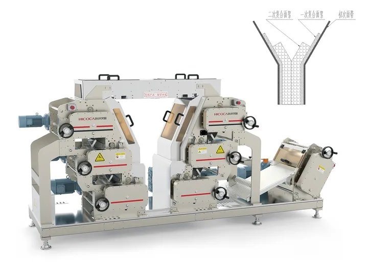 以“助力食品企業(yè)實現消費者口感上的幸福”為使命,??萍寻蜒邪l(fā)重點放在了如何實現消費者“舌尖的滿足”。就鮮面條這一頗受歡迎的主食來說,在市場上流通的鮮面無論是從消費者角度,還是從餐飲從業(yè)者角度來看,都是存在很多痛點的。“粘牙、不勁道、沒有彈性、不易煮……”,這些都是一些常見的共性問題。為了解決這幾個問題,海科佳智能鮮濕面生產線在壓面工序上研發(fā)出“片絮復合”的壓延工藝,通過面絮與面帶的三次復合,使面帶形成由內而外密度依次減小的的層次感,這樣做出來的面條就達到了內松外緊,勁道爽滑的口感。